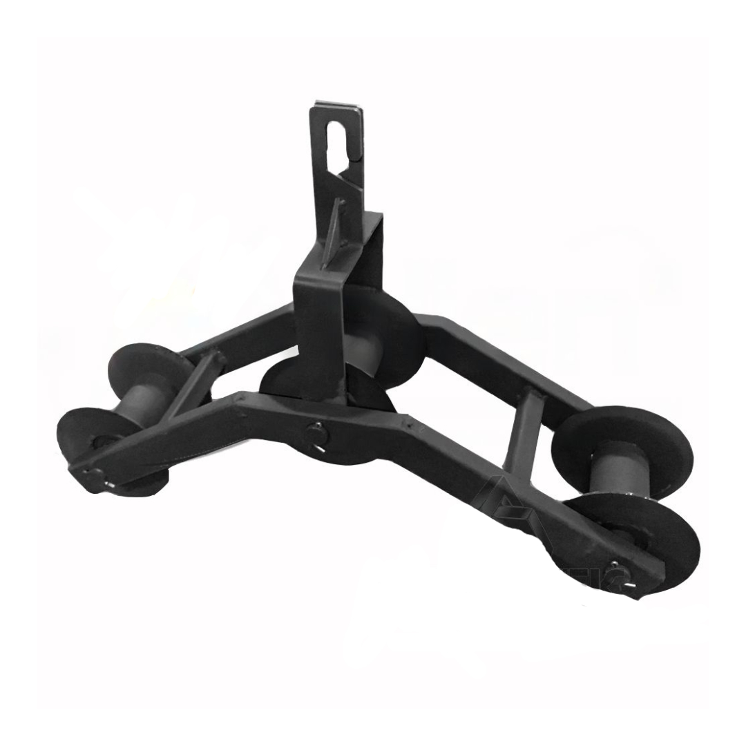 Подвесной угловой ролик состоит из двух шарнирно соединенных рамок, одна из которых, имея в своем составе три катушки на подшипниках, под воздействием нагрузок, самоустанавливается под нужный угол прохождения кабеля. Вторая рамка с крюками является несущей и служит для установки ролика на кронштейнах.