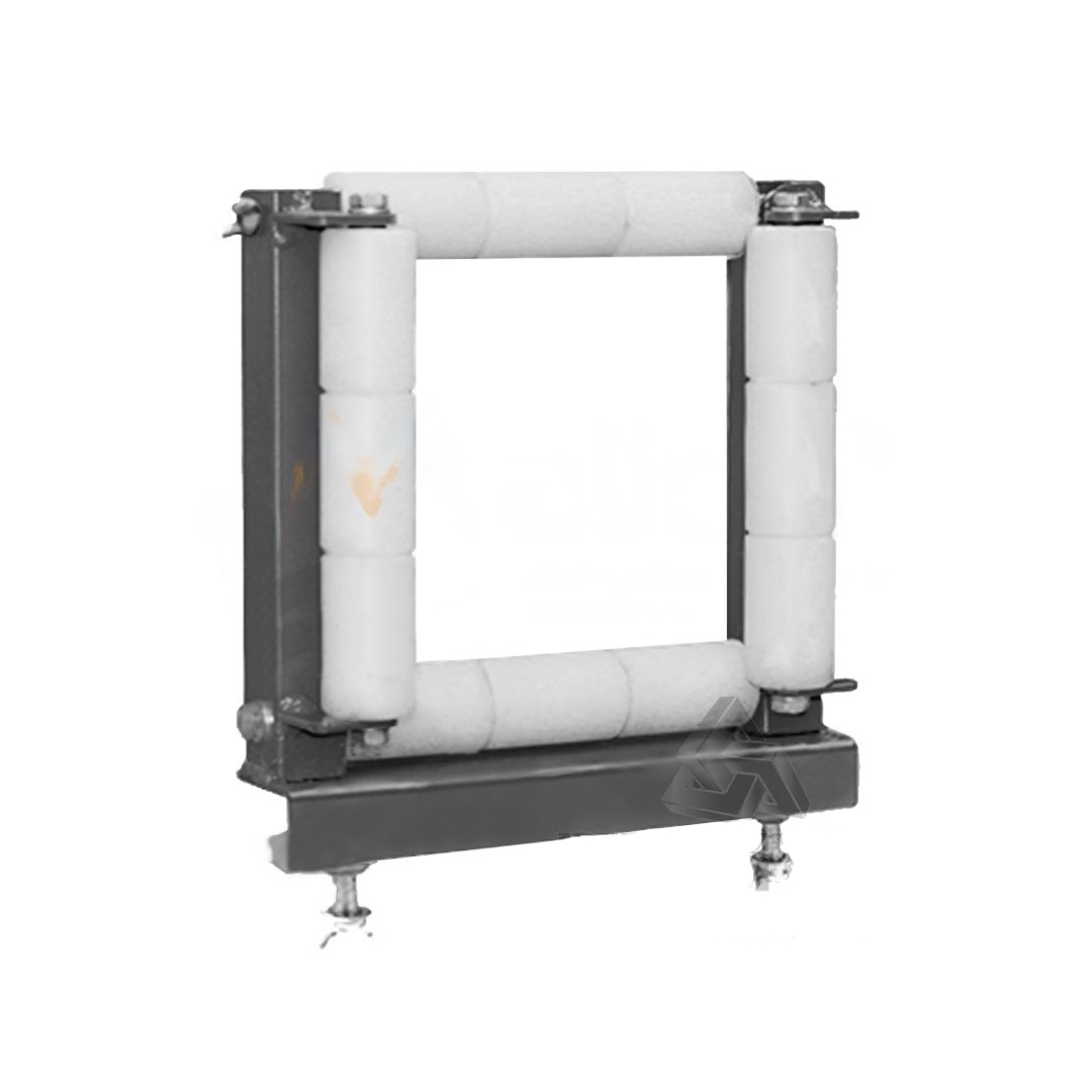 Рама кабельного ролика изготовлена из прочной стали, а рабочие валы - из износостойкого капролона. Горизонтальный валик является рабочим и принимает всю нагрузку на себя. Два вертикальных вала служат для поддержания кабеля в рабочем поле кабельного ролика. Верхний горизонтальный вал является шарнирно поворотным, что позволяется легко завести или извлечь кабель в (из) рабочую область кабельного ролика.