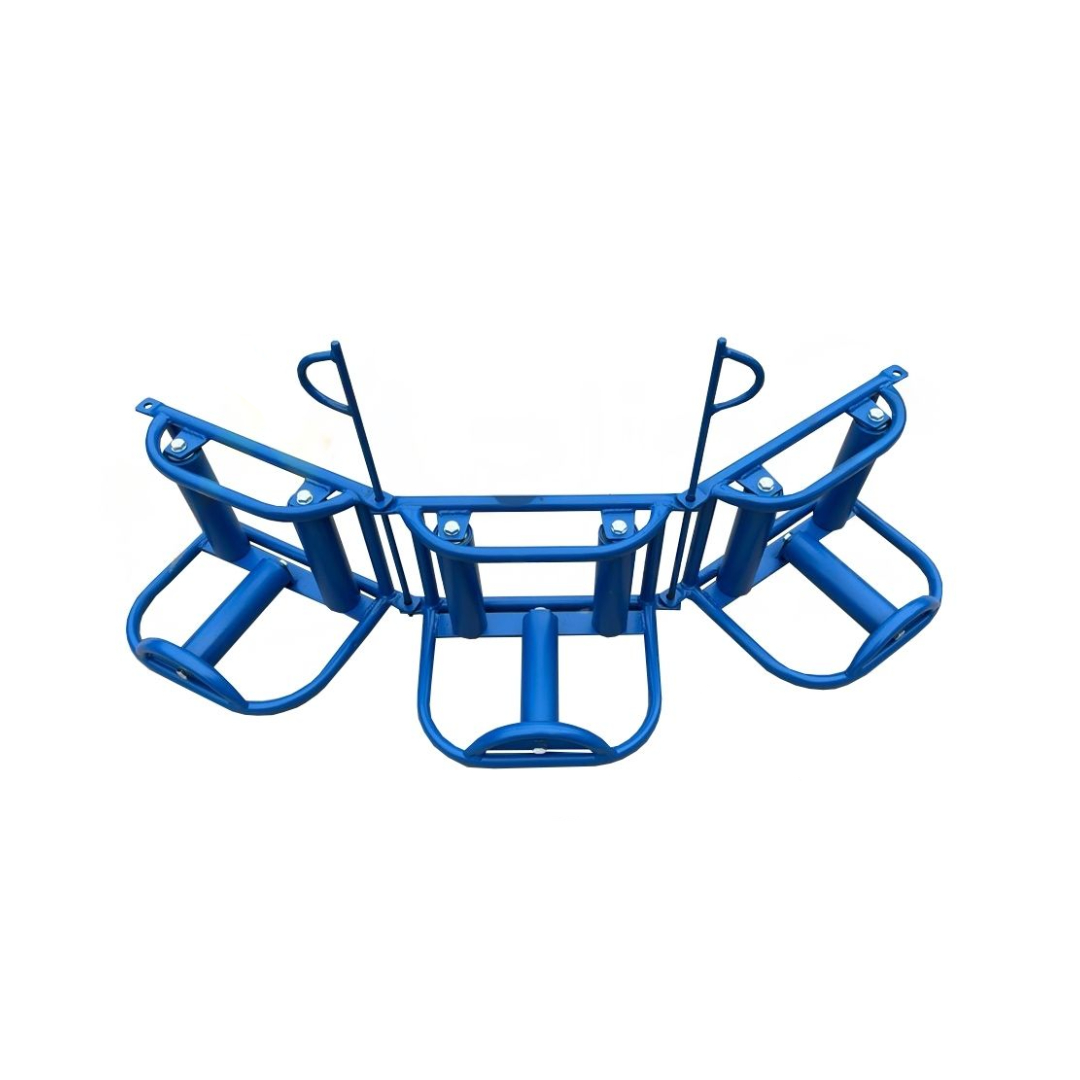 Ролик для кабеля РКУ-150М имеет крепкую металлическую трубчатую раму, конструкция которой позволяет соединять между собой с помощью фиксирующих штырей данные ролики в цепи для прохождения сложных или затяжных углов поворота кабельных трасс.