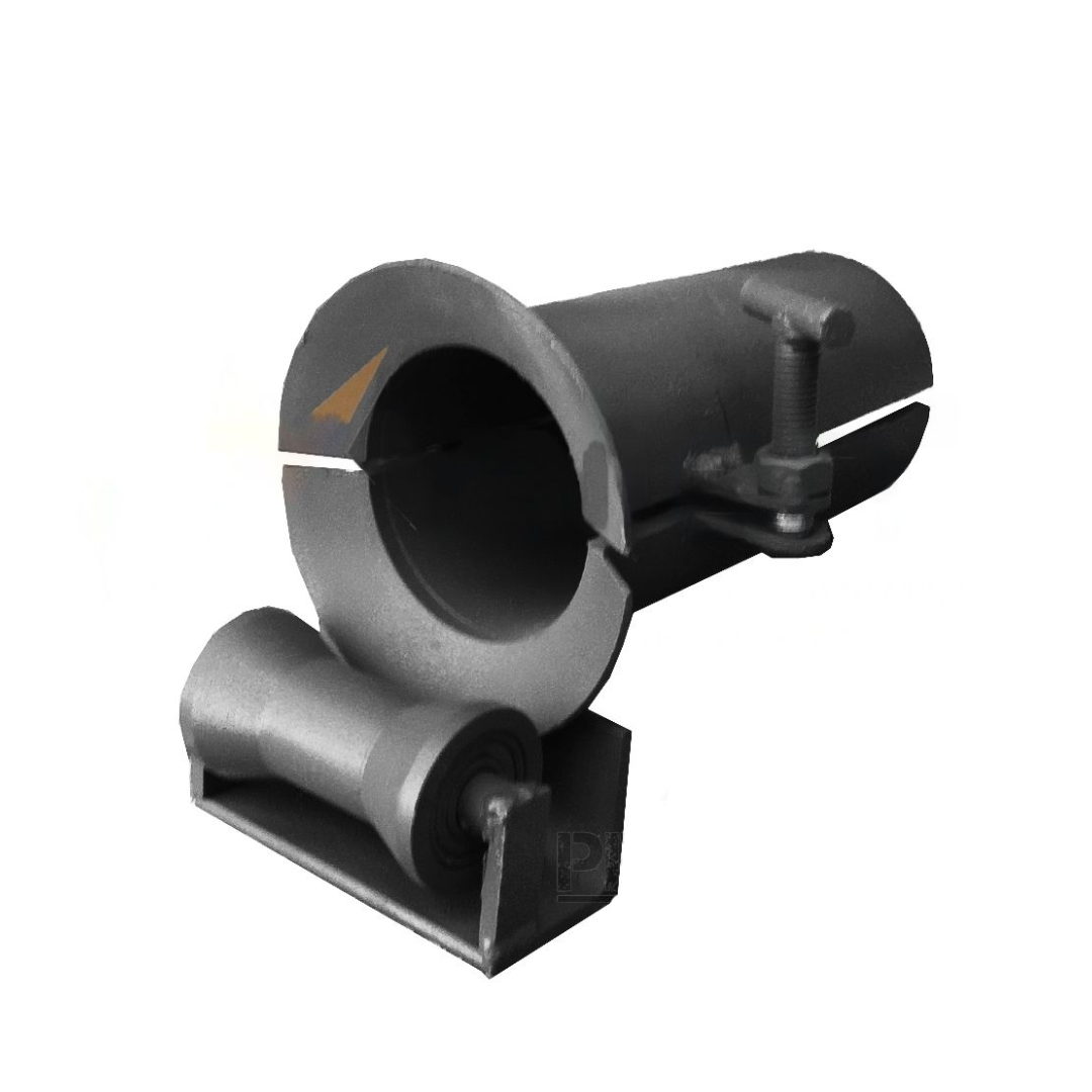 Данный патрубок представляет собой разъемную конструкцию с раструбом и поддерживающим роликом. Для установки в рабочее положение патрубок вставляется хвостовиком в трубу и разжимается в ней с помощью болта для фиксации.
