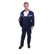 Куртка укороченная на поясе с супатной застежкой на пуговицы. Сверху два накладных кармана на клапанах, снизу два накладных с "косым" входом. Полукомбинезон с боковыми накладными карманами и накладным нагрудным карманом с клапаном. На костюме отделочная контрастная строчка. По линии кокетки и на карманах СОП 2,5 см.